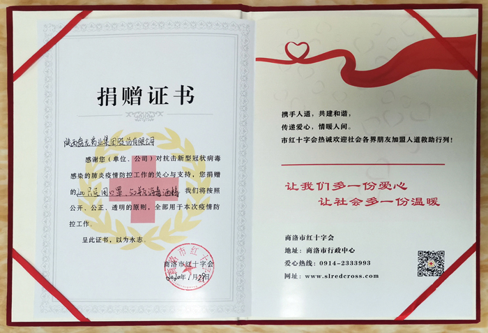为起劲应对新型冠状病毒熏染肺炎疫情,,,,,,公司向商洛市红十字协会捐赠了200个医用口罩,,,,,,50瓶医用酒精